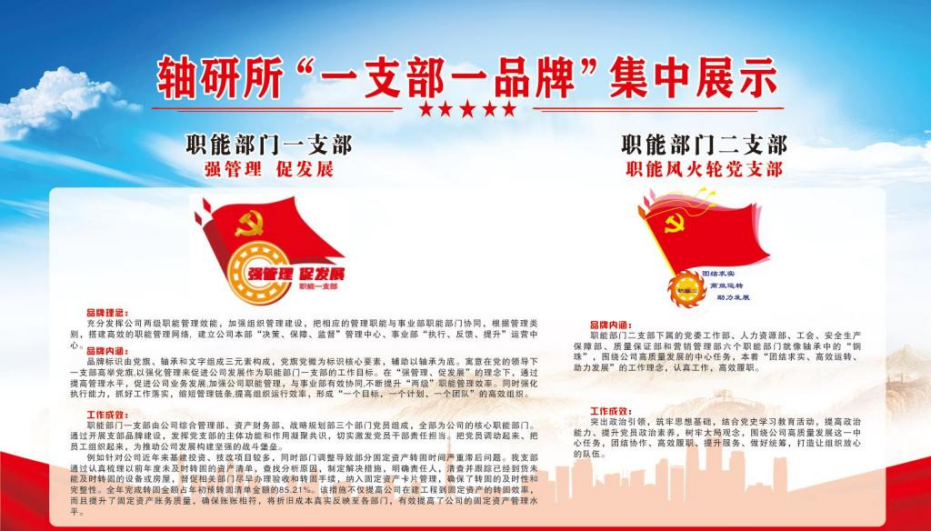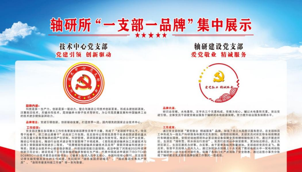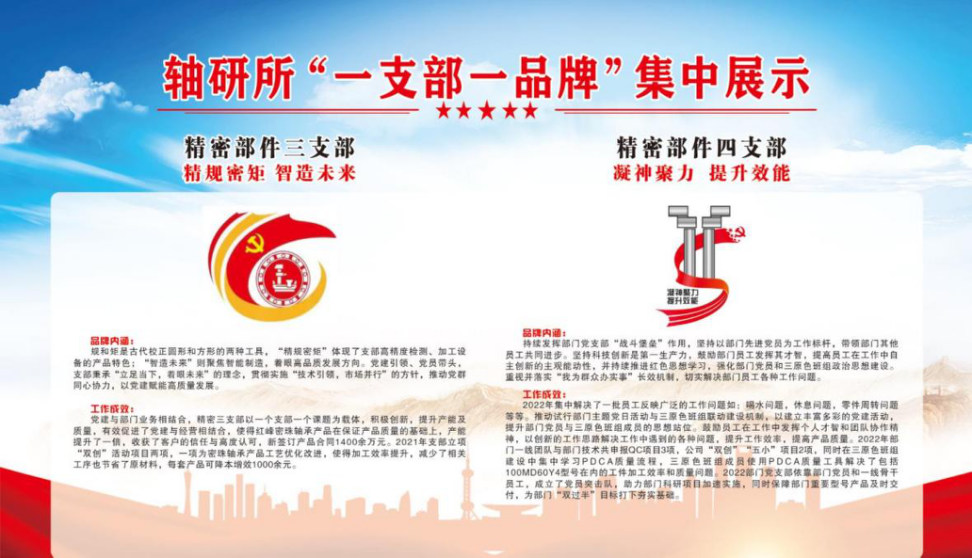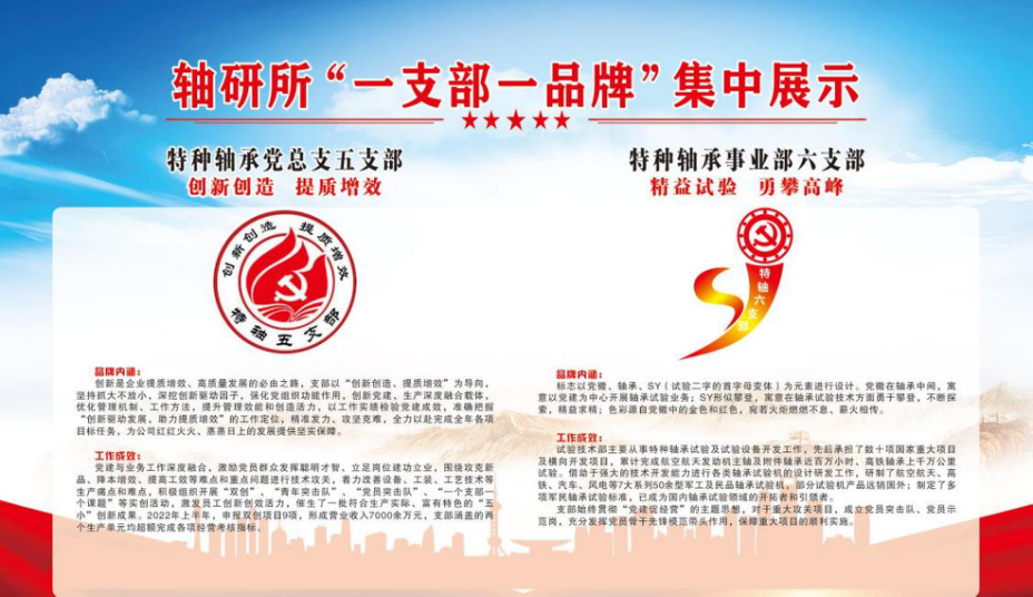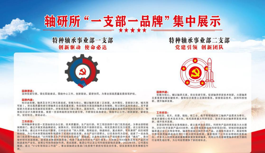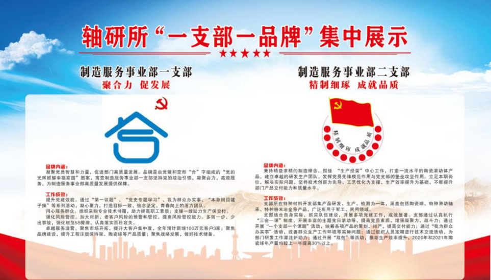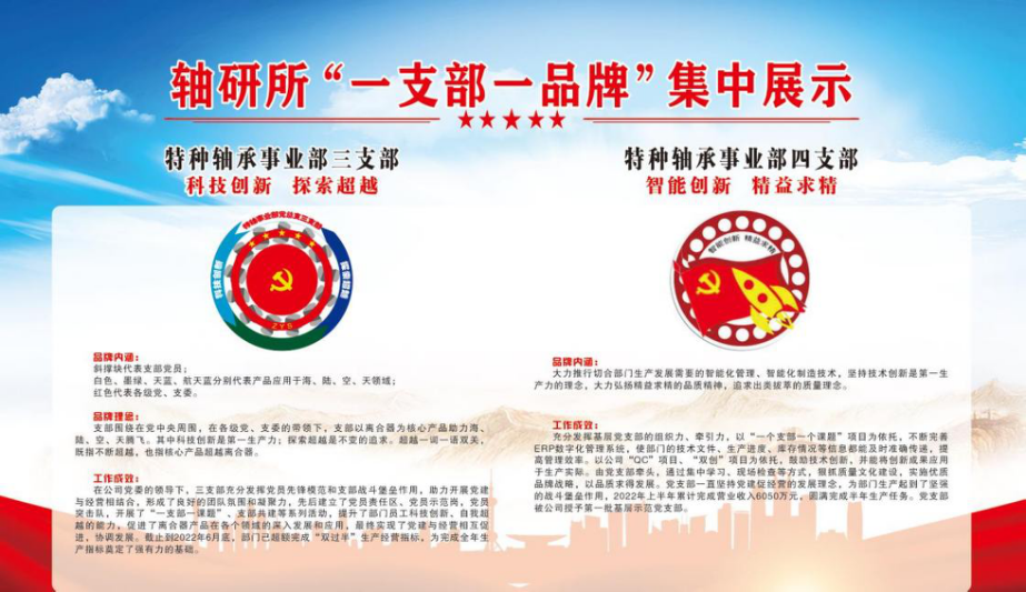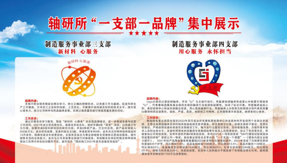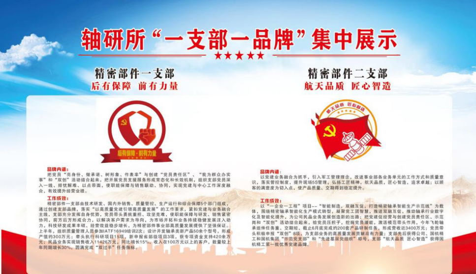 各党支部品牌充分体现了部门工作和党建特色,制造服务事业部三支部“新材料·心服务”,“新材料”强调了部门以材料创新为使命,“心服务”既体现了事业部的工作特点,也表明用心为客户服务的工作宗旨;制造服务事业部二支部“精制细琢·成就品质”,展现了支部所在特种材料开发部精益求精、雕琢技艺的发展理念;精密部件事业部二支部“航天品质·匠心智造”,既代表以工匠精神追求卓越,也指向部门持续推动精密轴承数字化、智能化提升。