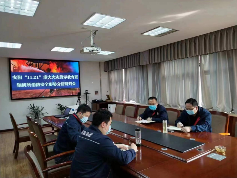 11月22日,轴研所在所区和高新产业园分别召开安阳“11·21”重大火灾警示教育暨消防安全形势分析研判会,认真学习贯彻习近平总书记重要指示精神,吸取安阳事故惨痛教训,对疫情防控和生产安全进行再动员再部署,统筹推进疫情防控与消防安全工作措施落实落地,确保职工生命安全和特殊时期企业生产的安全运行。轴研所党委书记、董事长高元安,党委副书记、总经理高飞分别主持会议,各部门驻厂负责人参加,并于会后开展消防隐患专项检查。